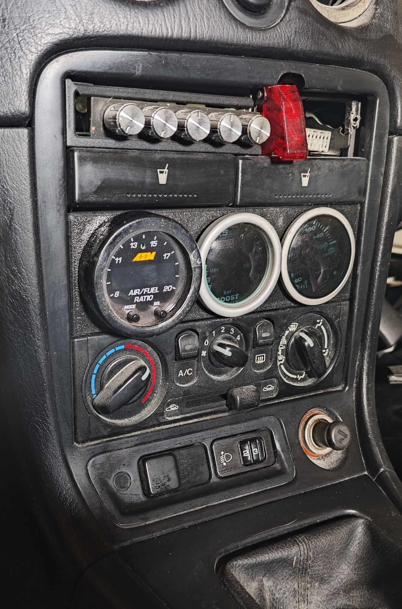 Panel pozwala zamontować trzy wskaźniki 52 mm w tunelu środkowym — to wyjątkowo schludne rozwiązanie, dzięki któremu otrzymasz najważniejsze informacje o pracy silnika bez dokładania brzydkich mocowań zegarów które wymagają wiercenia otworów w desce rozdzielczej oraz bez poświęcania nawiewów, a jednocześnie wciąż pozostaje miejsce na radio 1 DIN.